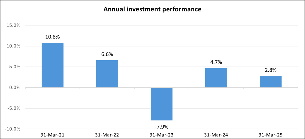 Over the year to 31 March 2025, the overall return on the portfolio was approximately 2.8% with circa £35 million received in cash distributions from the invested assets to assist with cashflow. Over the five-year period from 2020, the average return on the Trust’s investment portfolio was 3.2% per annum and over the ten-year period from 2015, it was 3.9% per annum.