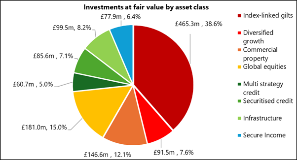 The Board’s current target is to hold 40% of assets in index-linked gilts, with the other 60% divided between global equities, multi-asset funds, commercial property, infrastructure assets, corporate debt, securitised credit and cash. The asset allocation strategy is designed to ensure that the assets are diversified and of appropriate investment quality.